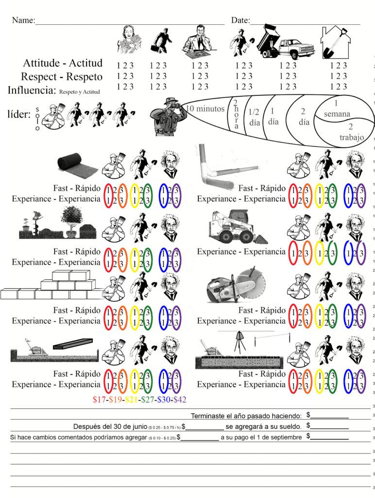 All employees start at $17/hr in 2026. Evaluations occur weekly for the first 30 days to determine appropriate pay, again 90 days later, and again every June. An example pay sheet with 2026 pricing is provided at the bottom of this page